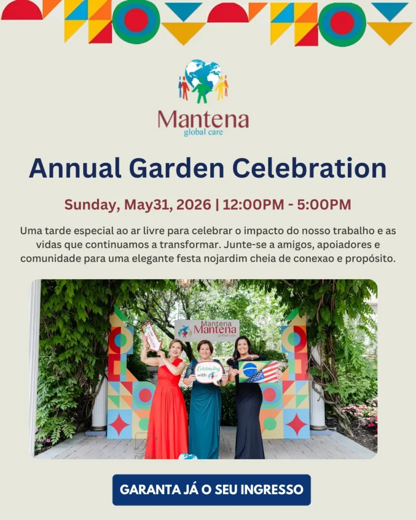 A Mantena Global Care tem o prazer de convidá-lo para sua celebração anual, que este ano ganha um formato especial: uma elegante garden party em uma tarde de domingo. O evento acontecerá no dia 31 de maio de 2026, das 12h às 13h, no belíssimo espaço Nanina’s In the Park (540 Mill St, Belleville, NJ 07109).